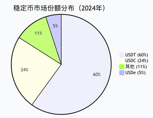 - USDT凭借先发优势和广泛的交易所支持,占据约60% 市场份额,成为市场基准